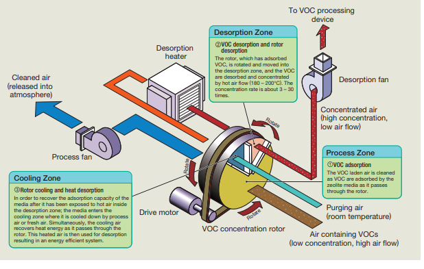 By using SOLVENTCLEAN, exhausted gases in large air volumes containing low concentrations of VOC, can be concentrated with high concentrated. And by combining SOLVENTCLEAN existing (oxidization method, recovery method, ect.) processing equipment, efficient processing of exhaust gases contain VOC has become possible.