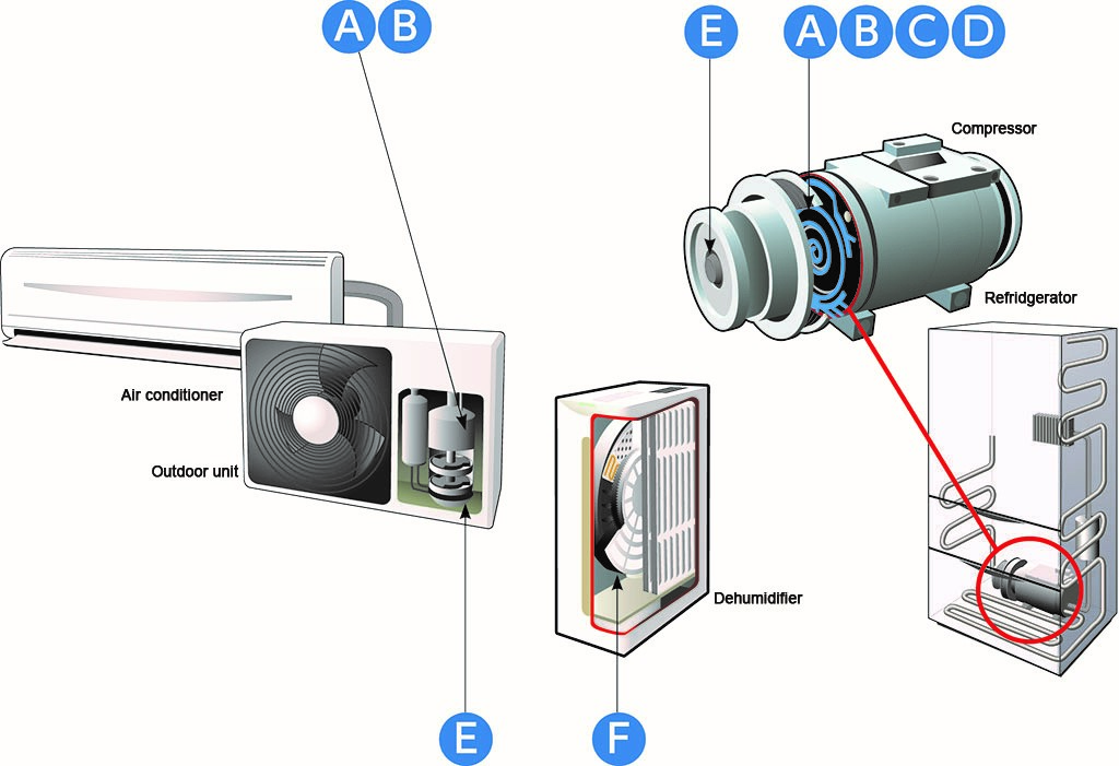| (D) Chip Seal | EXCELIDE™ Sealing material used for air conditioners. Air conditioners compress and liquefy chlorofluorocarbon as a cooling medium and remove heat and lower the temperature by vapourizing it. This material seals in the chlorofluorocarbon. |
