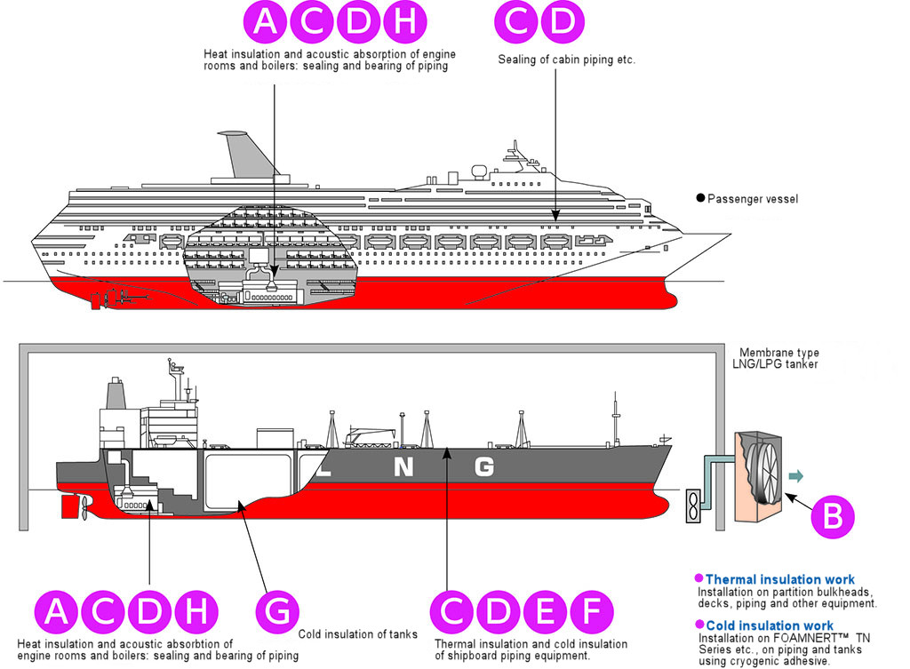 - Thermal insulation and cold insulation of shipboard piping equipment - Used for the piping and tanks of LNG/LPG terminals, ships, petrochemical plants |