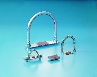 (G) Piping Support NAFLON™ U Bolt - This piping support, which uses PTEE with filler on the sliding surfaces, allows smooth extension and contraction of piping caused by temperature changes on a ship. |