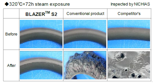 NICHIAS conducted testing at 320°C exposure for 72 hours in steam. NICHIAS BLAZER™ S2 remained unchanged while others at extreme cases ‘sparkled’ or melted, and Steam found a vent through competitors’ products deteriorating the material further and thereby rendering the sealing material unusable.