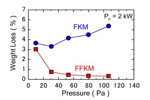 These experiments confirm that both materials experience erosion by low-energy positive ions bombardment but at different rates. FFKM seems to have more stability in high pressure environments without rf power. This makes FFKM more stable in that application whereas FKM suffers major weight losses.