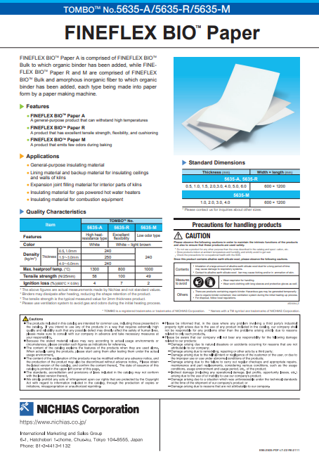 FINEFLEX BIO Paper M is a product that adds a small number of binders to FINEFLEX BIO Bulk and amorphous inorganic fiber and is manufactured into a paper form with the use of a paper manufacturing machine. It is a product with little odor when fired.